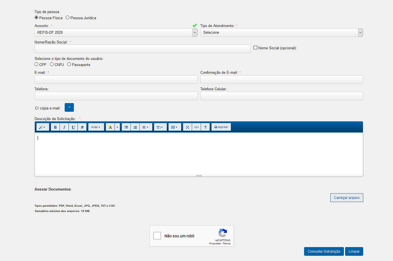 No Atendimento Virtual, na opção Refis-DF 2020, o contribuinte pode tirar dúvidas sobre como aderir ao Refis e ter auxílio para fazer as simulações, a adesão e a geração de documentos para pagamento. Esse atendimento pode ser acessado em qualquer horário.